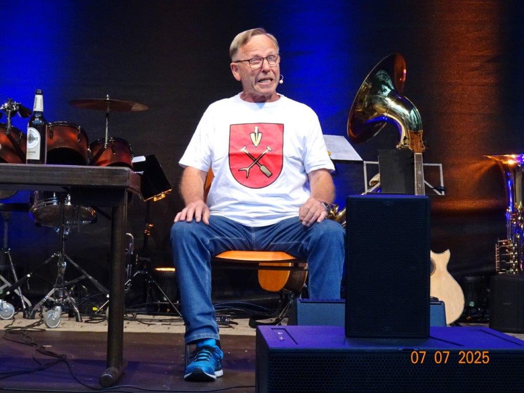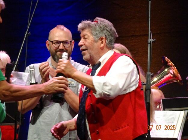 Zum Abschluss des Bunten Abends übernahm dann wieder Uwe Dürr den Dirigentenstab beim Musikzug, denn das obligatorische Badnerlied durfte nicht fehlen. Dazu wurde BGM Michael Möslang auf die Bühne gerufen, er wiederum rief nach Alt-Bürgermeister Waldemar Schütz, der mit ihm die Hymne anstimmte. Die Festgäste hatten sich alle zum mitsingen erhoben und so fand unser schöner Bunter Abend sein Ende. Ein Danke an unseren Vorstand Klaus und ein großer Dank an unsere Gemeinde, dass wir Teil des Programms sein durften und an alle, die dieses Fest mit gestemmt haben. Inzwischen hatte es kräftig abgekühlt und die Gäste verließen den Platz und gingen haam, oder hoom? Auf jeden Fall ins Warme.