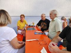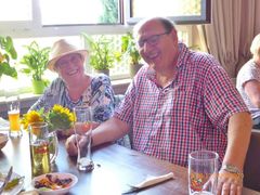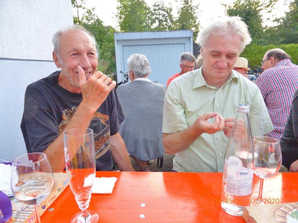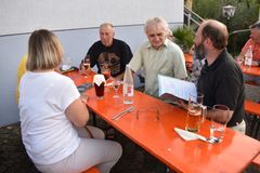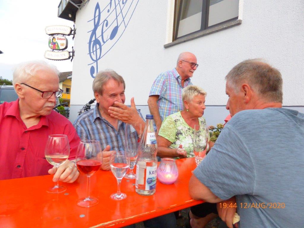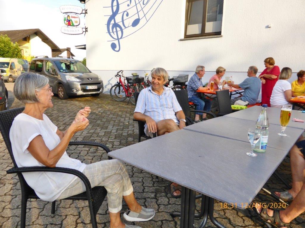 Das war die Frage bei unserem ersten Radeltreff in den Ferien. Nach so langer Trockenheit war natürlich Regen im wahrsten Sinne des Wortes heiß begehrt. So hat sich unser Oberradelführer Rainer richtig entschieden: Radeln fällt aus, Regen marsch!! Ein schöner Gewitterregen fiel herab, aber nach 18.00 Uhr, pünktlich zum Einkehrschwung um 19.00 Uhr zeigte sich das Wetter wieder freundlich. Zuerst saßen nur die Mutigen im Freien, aber später folgten die anderen, die im Lokal Platz genommen hatten, gerne nach draußen. Die Wirtsleute vom Waldblick hatten sich sehr viel Mühe gegeben, uns für ein paar Stunden mit Speis und Trank und freundlichem Service zu verwöhnen.