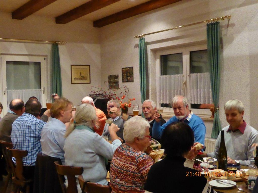 Während der Singstunde hatte man schon einen verlockenden Duft in der Nase. Das kam daher, dass sich Rosi und Henry etwas Tolles für uns ausgedacht hatten. Sie wollten mit uns ihren 150. Geburtstag feiern, dazu hatten sie wunderbaren Käse, Baguettes und exzellenten Wein für uns mitgebracht. Mit Begeisterung wurde getafelt und spätestens mit Heidi und Klaus Eichstellers musikalischer Einlage französischer Chansons, konnte man das „Savoir-Vivre“ spüren. Das war mal wieder ein gemütlicher Abend – herzlichen Dank euch für diesen kulinarischen und akustischen Schmaus.