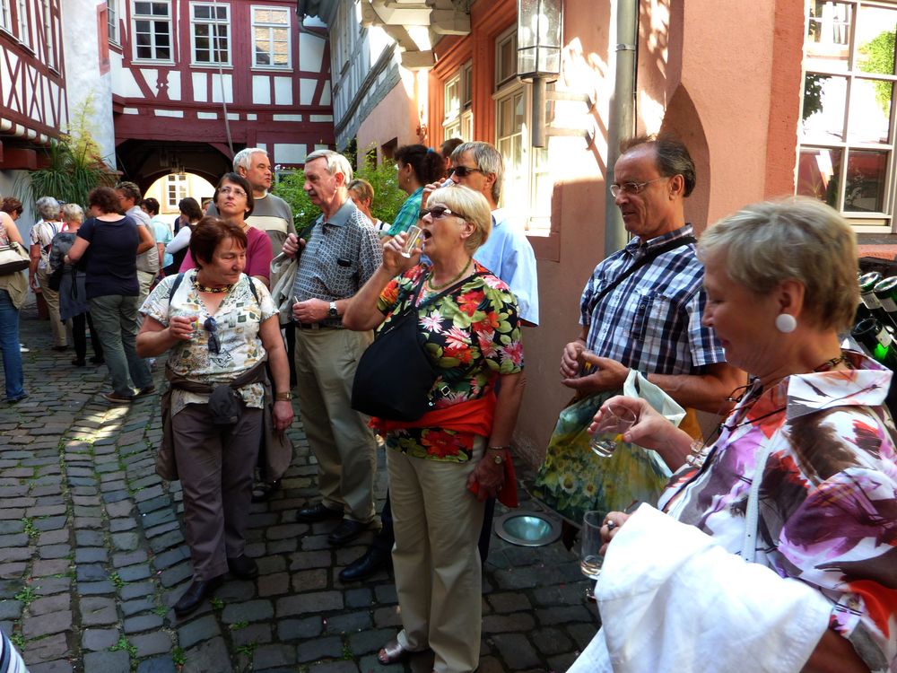 Am 10.9. um 8.00 Uhr ging‘s los. Wir fuhren in aller Gemütsruhe, wir hatten es ja nicht weit, mit dem Bus und bestem Wetter über den Rhein. Auf einem Parkplatz kurz vor Neustadt machten wir die obligatorische Frühstückspause. Alle blickten voll Sorge gen Himmel. Der Wetterbericht hatte uns Sonnenschein und 27 Grad versprochen - aber es herrschte Nebel. Voll Optimismus setzten wir unsere Fahrt nach Neustadt fort wo wir uns am Bahnhofsplatz mit zwei Damen vom Touristikbüro trafen. In zwei Gruppen aufgeteilt wurden wir durch Neustadt geführt. Die Sonne setzte sich durch und vertrieb die Nebelschwaden. Alle waren überrascht, wie nett und anmutig sich die Altstadt präsentierte. Kleine urige Gasthäuser in liebevoll restaurierten Fachwerkhäusern luden in den vielen Gassen und Winkeln zum verweilen ein wo wir zum Ende der Stadtführung zwei Sorten Wein probieren durften. In dieser weinseligen und gut gelaunten Runde stimmte unsere Vizedirigentin Reinhilde Fürniss auch prompt zwei passende Lieder an. Das „Rheinweinlied“ und „Nun leb wohl Du kleine Gasse“ sangen alle mit Begeisterung.