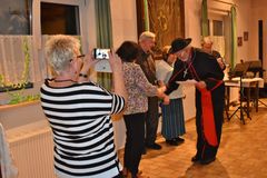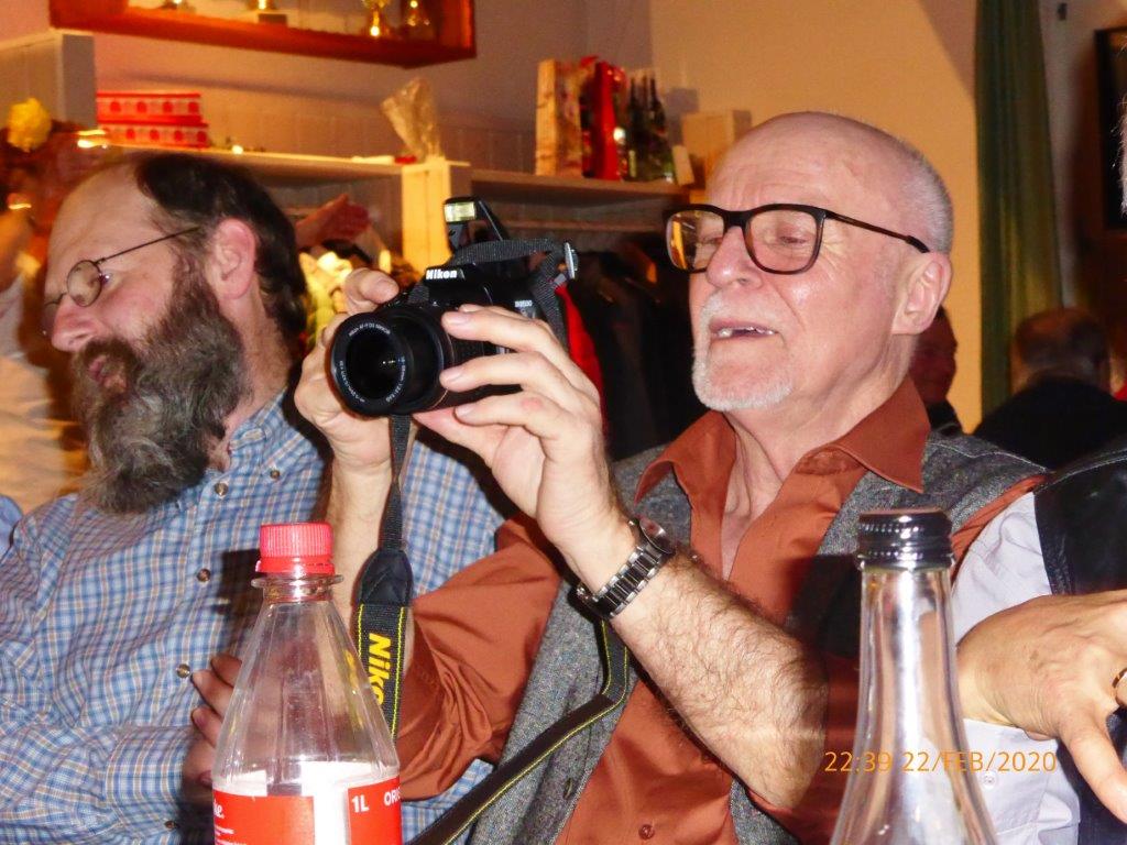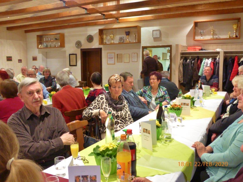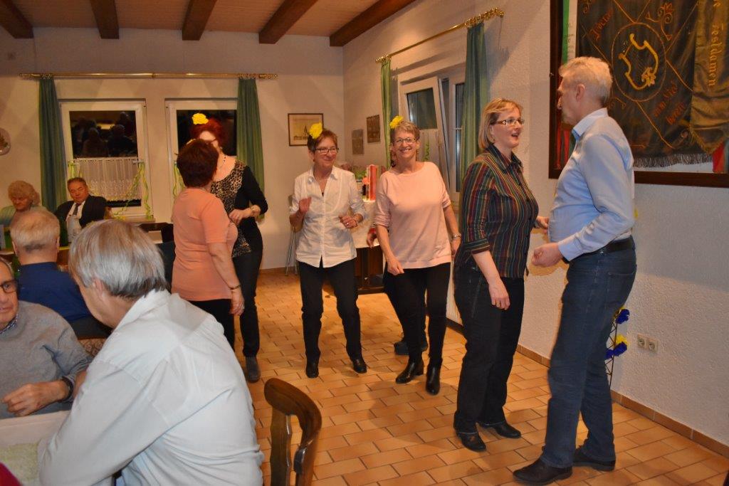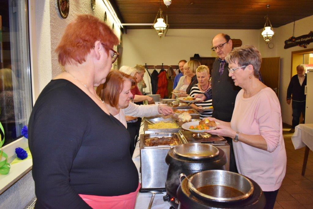 Nach einem Sektempfang sangen wir die vier Wunschlieder, das Geburtstagslied, Weit, weit weg, Welch ein Geschenk ist ein Lied und den Irischen Segenswunsch. Unser Vorstand Klaus Reinhardt überreichte Wilfried Jung ein Präsent des Vereins, da Wilfried passend an diesem Tag seinen Geburtstag hatte. Die beiden Christas hatten schon ein paar Tage zuvor ihre 75. Geburtstage begangen. Die Gäste wurden von den Jubilaren begrüßt, dann wurde das Buffet eröffnet. Wir wurden wieder bestens verwöhnt und mit Hintergrundmusik durften wir es uns schmecken lassen. Der Musiker Joschi, ein Saarländer mit Allgäuer Wurzeln, verstand sein Handwerk und hatte die passenden Songs für die Gäste parat. Da war die Tanzfläche nach dem Essen ständig belegt und es wurde ausgelassen getanzt.