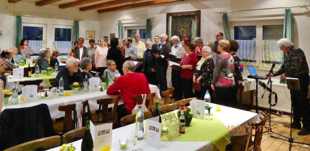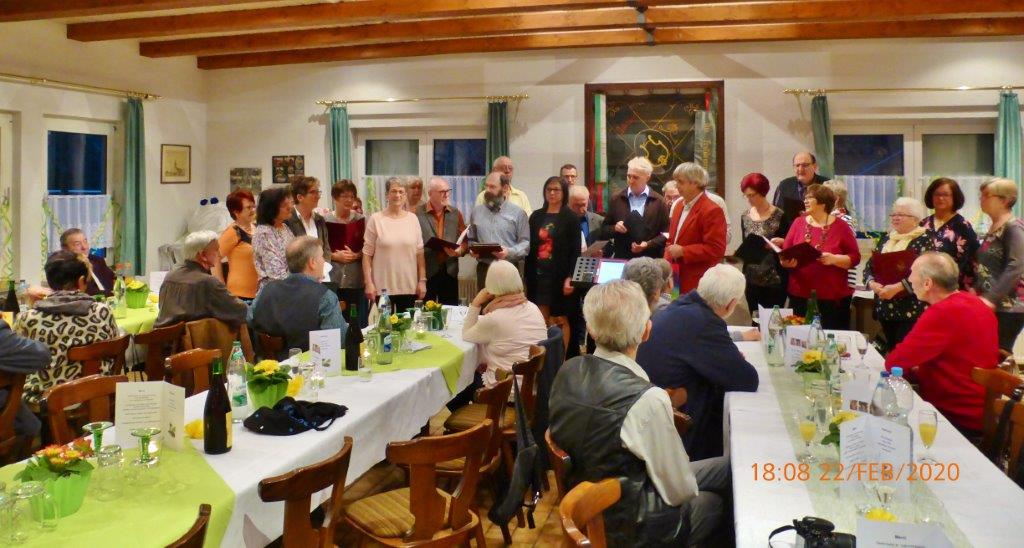 Am Samstag 22.02. waren wir zu einer besonderen Geburtstagsfeier eingeladen. Christa Lang, Christa Jung-Wittiger und ihr Mann Wilfried feierten ein gemeinsames Geburtstagsfest - zusammen kommen sie auf 232 Jahre. Die Geburtstagswunschlieder mussten wir a capella singen, da unser Dirigent leider verhindert war. Diesen Part übernahm Heidi Winter, die dafür kurzfristig eine andere Feier verließ um uns zu dirigieren – vielen Dank Heidi.