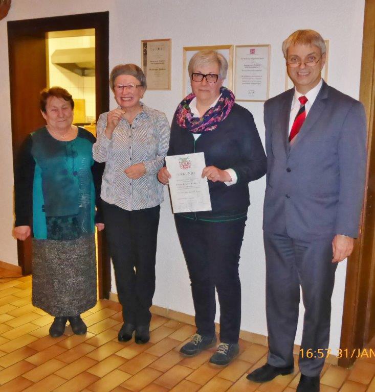 Der Chor sang nochmal zwei schöne Lieder, bevor die Ehrungen vorgenommen wurden. Klaus Reinhardt und Christa Jung-Wittiger ehrten Doris Meder für 5 Jahre aktives Singen und mit der silbernen Ehrennadel die Frauenvertreterin der Chorverbandsgruppe Hardt, Jutta Braun-Wingert, für 20 Jahre Mitgliedschaft. Für 40 Jahre Mitgliedschaft wurde Maria Krebs zum Ehrenmitglied ernannt. Da Maria leider nicht anwesend sein konnte, wird ihr die Urkunde persönlich nachgereicht.