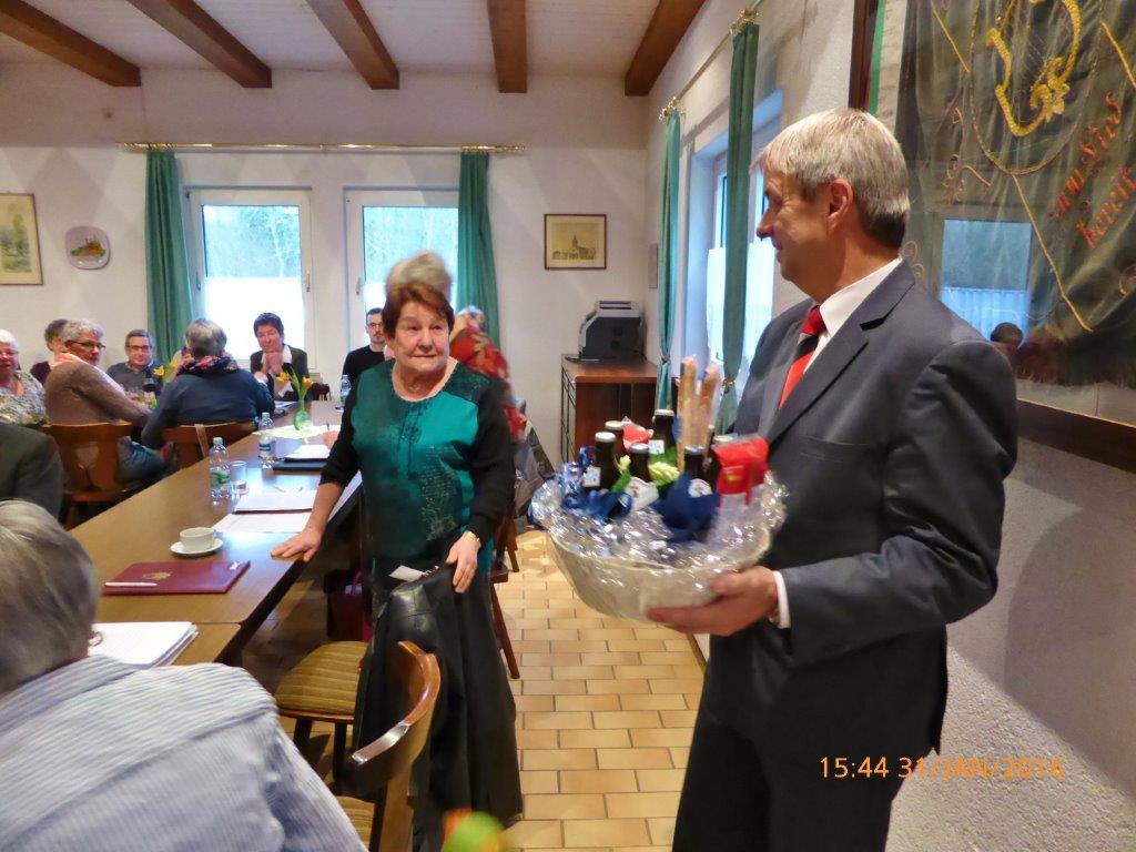 Nach der Eingangsrede ließ Pressewartin Doris Meder das Sängerjahr noch einmal lebendig Revue passieren und überraschte am Ende Klaus Reinhardt mit einem kleinen Präsent des Vereins. Die Arbeit seiner 10-jährigen Vorstandschaft sollte einfach mal gewürdigt werden. Die Vizedirigentin und Kassiererin Reinhilde Fürniß hat ihr Amt auch schon 10 Jahre inne und bekam von der 2. Vorsitzenden Christa Jung-Wittiger originelle Handschuhe mit Klettbeschlag, so dass sie auch künftig das Geld fest in Händen hält. Unsere Notenwartin Brigitte Lang wurde für 30 Jahre Vorstandstätigkeit in verschiedenen Ämtern mit einem Frühlingsstrauß geehrt.