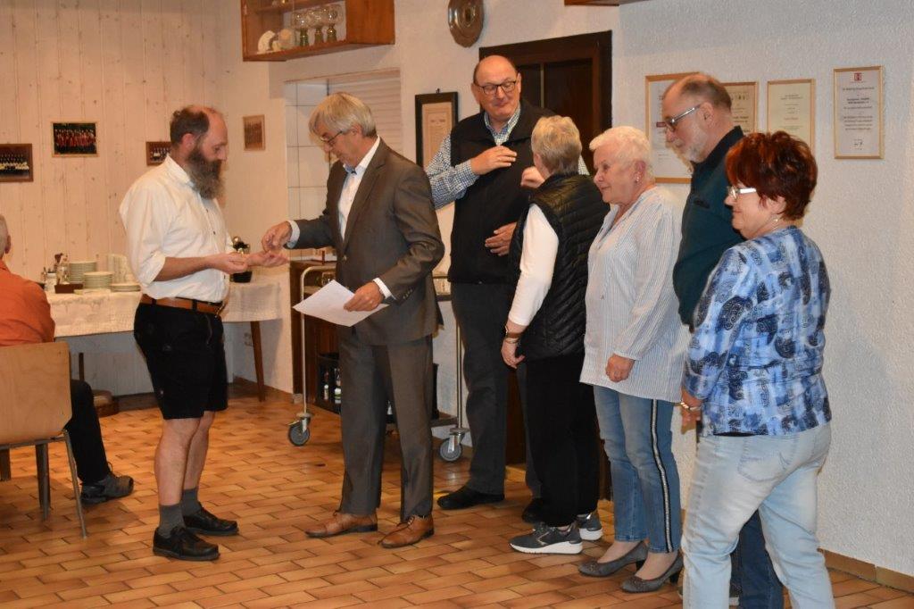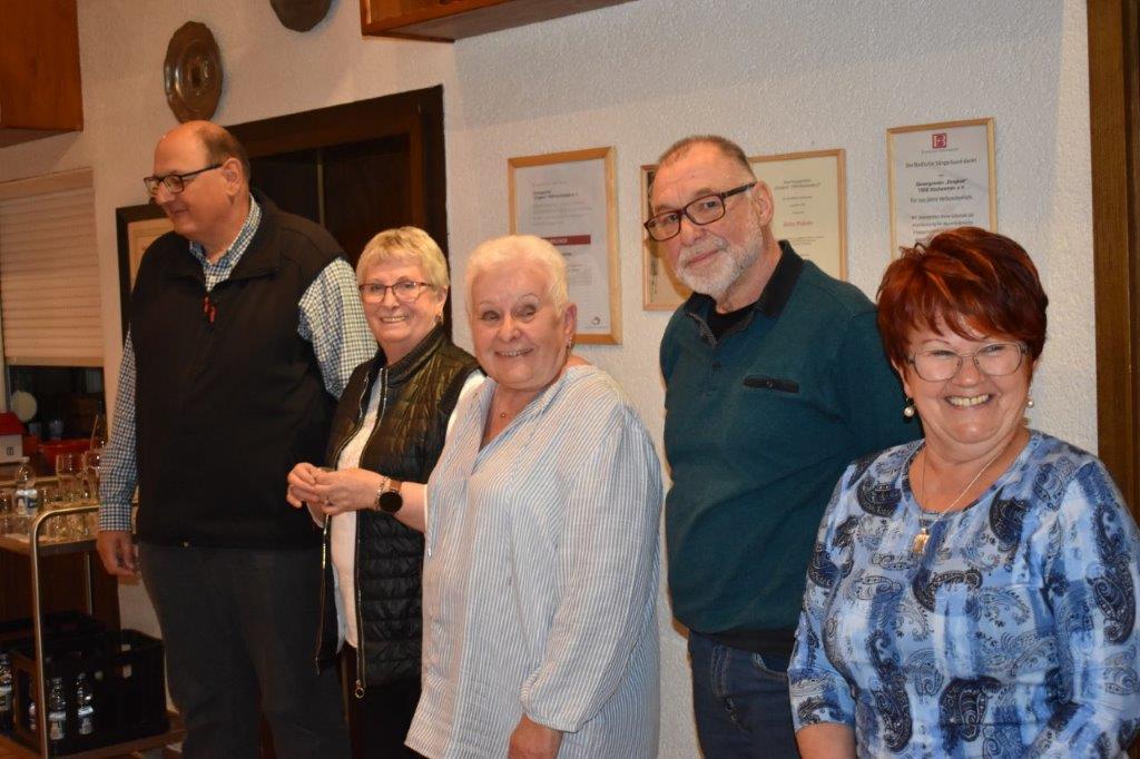 Nach einer kleinen Pause ging es bei der JHV mit Ehrungen von 5 Aktiven weiter. Die Ehrungen der passiven Mitglieder wurden auf 2023 verschoben. Markus Ksienzyk konnte gleich in seinem neuen Amt als Vizevorstand den 1. Vorsitzenden Klaus Reinhardt unterstützen. Klaus hatte für die Geehrten jeweils ein paar Worte parat und Markus durfte die Ehrennadel E anheften. Die wurden für 5 Jahre Singen im Chor an Hildegard und Dieter Setzchen, Uschi Alber, Bernarda Strzelecka und an Hartmut Gajocha-Eckert verliehen. Hartmut war es ein Bedürfnis noch einmal zu bestätigen, dass er so gerne zu unserem Chor nach Hochstetten kommt, weil er sich hier so wohl fühlt.