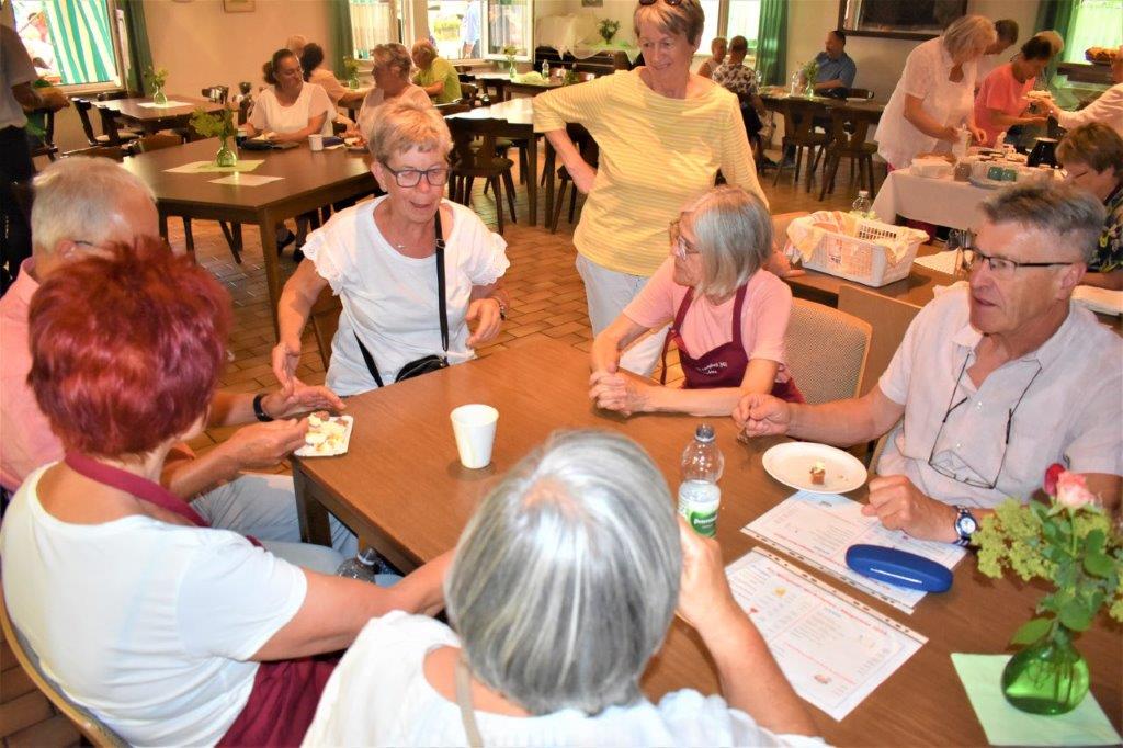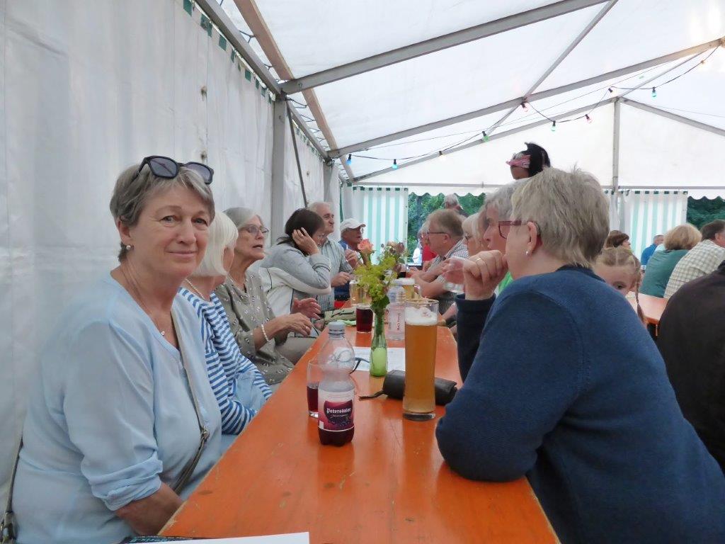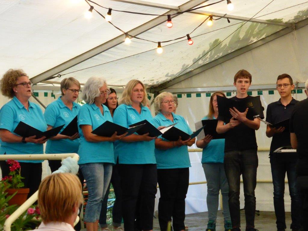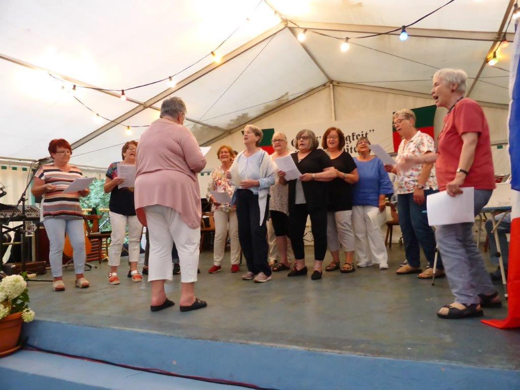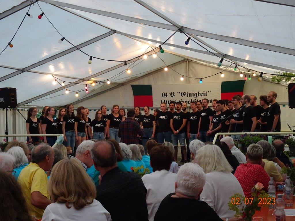 Unsere Gäste machten gerne von unserem vielfältigen deftigen Speisenangebot Gebrauch und auch die Kuchentheke wurde gerne anvisiert, weiß man, dass selbige immer sehr lecker bestückt ist. So stand bald der Abend der „Modernen – oder Jungen Chöre“ an, wie unsere taffe Moderatorin Biggi Brüstle dies definierte, passend in jedem Falle. Wir eröffneten das Programm mit vier Liedern, wobei unsere Sängerin Kristin dabei mit ihrem Solo bei Gabriella das Publikum total begeisterte, super Kristin. Es folgten die Chöre „Sing and Swing“ vom Sängerbund Friedrichstal, der „Coro Minuetto“ von unserem Bruderverein Sängerbund Linkenheim, „Cantiamo“ der Eintracht Spöck und unser absolutes Highligth, der „Jazzchor“ vom KIT. Dieser hat Ende Juli selbst an zwei Abenden ein Konzert, dabei sein lohnt bestimmt. Es hat sich auch gelohnt, ins Zelt in den Erlich zu kommen, konnte man dabei noch weitere Chöre unseres Dirigenten Aldo Martinez erleben. Ein vielfältiger musikalischer Hörgenuss war gegeben und wer Lust auf´s Singen bekommen hat, darf auch gerne mal freitags um 19.30 Uhr im Erlich zum Schnuppern in unsere Singstunde kommen, wir würden uns sehr freuen.