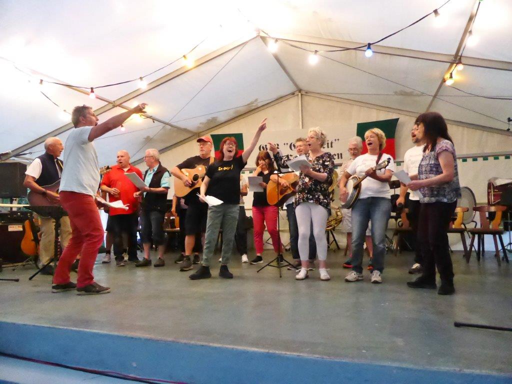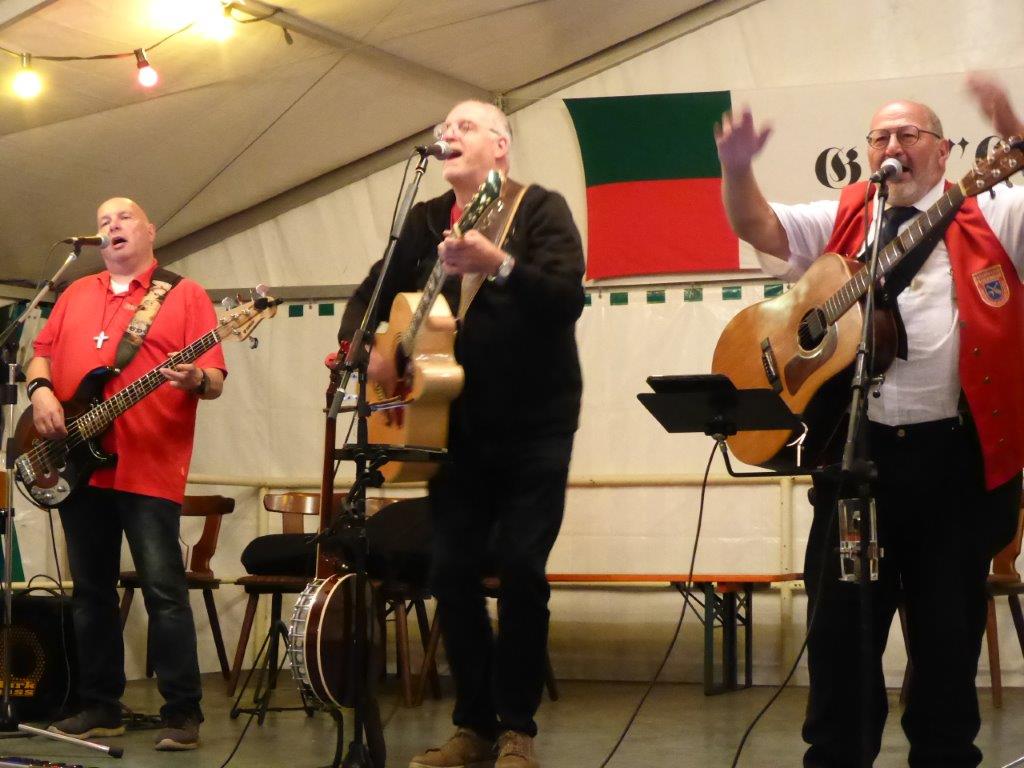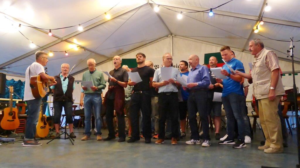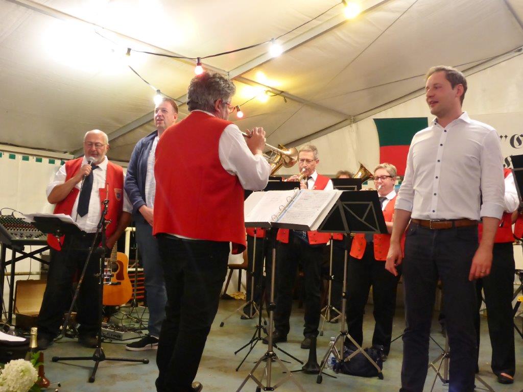 Nachdem sich am Sonntagabend die Modernen und Jungen Chöre so bravourös präsentiert hatten, war man natürlich auf den Montagabend gespannt. Da herrschte nachmittags schon emsiges Treiben im Vereinsheim, um die Festbesucher wieder gut verköstigen zu können. Das Zelt füllte sich und so konnte um 19.30 Uhr der Bunte Abend beginnen. Unsere Stimmungsmacher, der Musikzug der Freiwilligen Feuerwehr, machten ihrem Ruf alle Ehre, dieses Mal nicht nur instrumental, sondern auch ein gesanglich sehr mitreißender Auftakt.