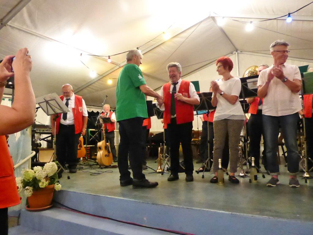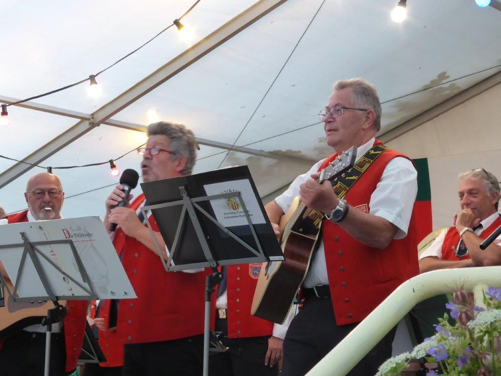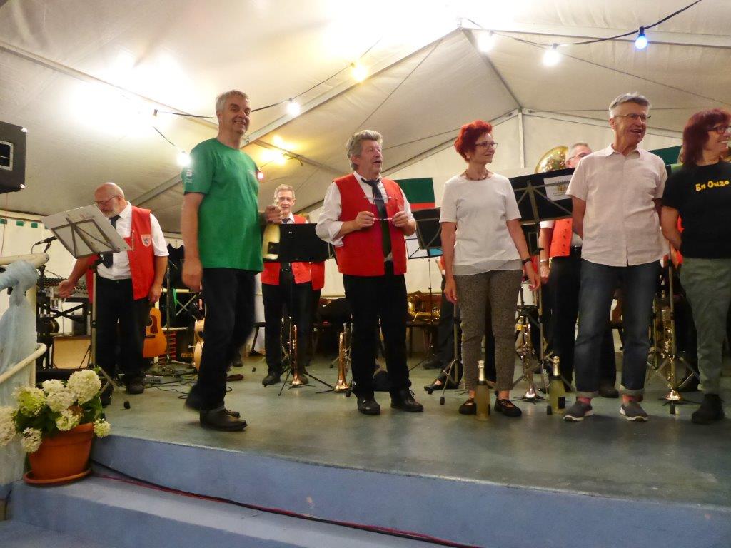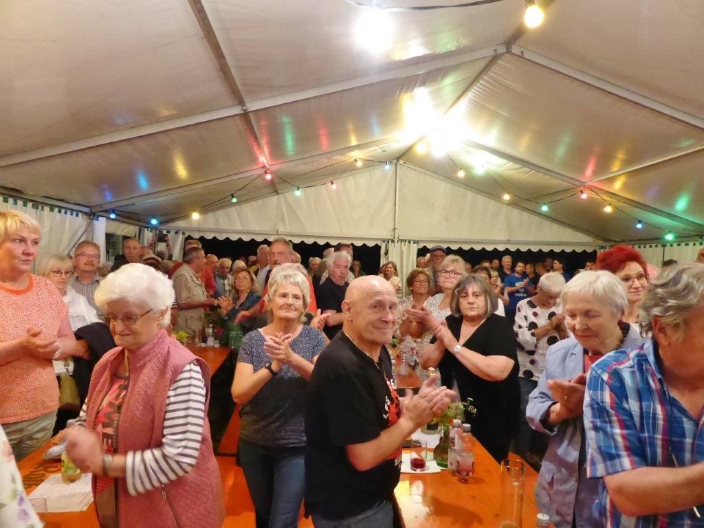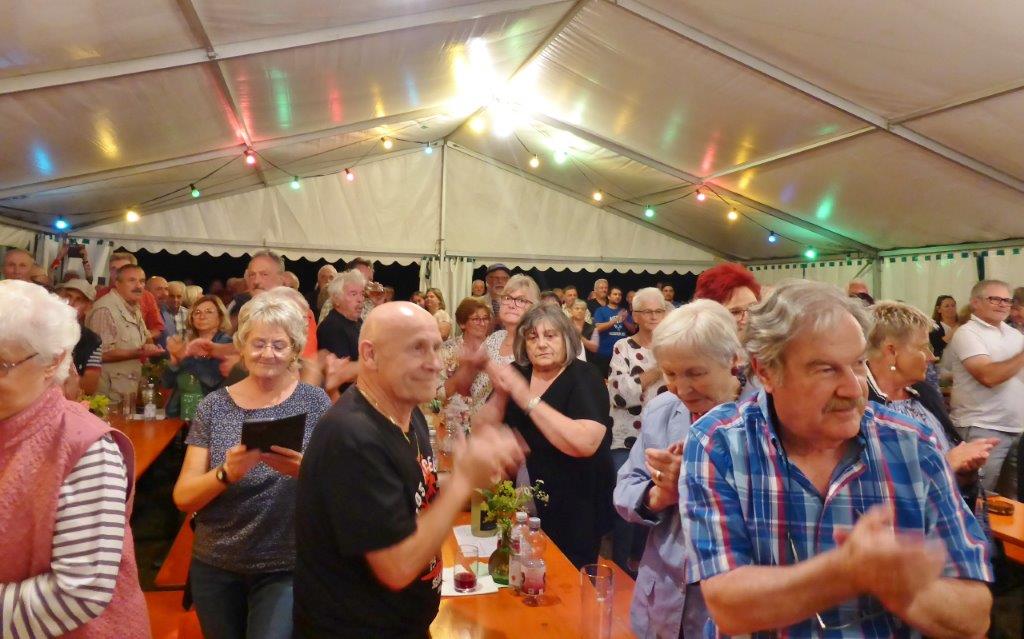 Die Gymnastikdamen des FVH folgten und entführten nach Paris, begleitet auf dem Akkordeon von Monsieur Eichsteller und seine Mme. Heidi motivierte: entré, entré, Mesdames, Monsieurs. Das gefiel dem Publikum, ebenso der Song „Heißer Sand“, den wir diesen Sommer auch am Bali spüren können. Brigitte Lang hatte die Mädels beim Dirigieren souverän im Griff. Die nächste Gruppe, die Prismaten, ließen´s krachen mit ihren Liedern und das Publikum sang begeistert mit, fühlte diese Lebensfreude, die da herüberkam, einfach toll, super, dass ihr da wart. Die Herren der TrimmDich-Gruppe des FVH musste sich auch nicht verstecken, mit Wolfgang König auf der Gitarre begleitet, kamen die Lieder gut an, vor allem konnte man einige Sangestalente heraushören. Wir wären mächtig stolz, wenn da der eine oder andere auch mal freitags zum Singen in den Erlich kommen würde!! Die Sangesgruppe der FFW überzeugte mit dem Erlich-Lied und ihren anderen Liedern natürlich die Besucher und hatten mit instrumentaler Begleitung und der sonoren Stimme von Roger Seitz viele Höhepunkte zu bieten. Alle aufgetretenen Gruppen waren super, so konnte unser Vorstand nur erste Plätze vergeben, ein Danke euch allen. Dazwischen fungierte unser Sänger Rainer als Moderator, gekonnt wie immer und mit nicht ganz jugendfreien Witzchen versehen, gab er seine Kommentare zu den aufgetretenen Gruppen. Diese bekamen symbolisch eine Flasche Sekt überreicht und unser Rainer verabschiedete sich nun nach 25 Jahren als Moderator vom Publikum, was stehende Ovationen und bewegende Momente auslöste, ist er doch unser Original und vom Erlich nicht wegzudenken. Auch unser Bürgermeister Michael Möslang und unser Ehrenbürger und Altbürgermeister Waldemar Schütz zollten Rainer Anerkennung für sein Engagement, das so schnell niemand ersetzen kann – Spitze Rainer, bravo! Die Herren hatten bereits Stellung auf der Bühne bezogen zu unserem obligatorischen Festabschluss, dem Badnerlied mit dem Musikzug der FFW. Das Publikum erhob sich und stimmte in die Strophen ein – welch eine Atmosphäre und eine Stimmung. Zuvor hatte Herr Möslang noch angekündigt, nächstes Jahr einen Rathaus-Chor für das Fest stellen zu wollen, eine schöne Idee, aber es fehlt unbedingt an Nachwuchs für unseren GV und so ein Fest zu stemmen, ist nicht einfach. Deshalb noch einmal ein Appell an alle, die hier so schön mitgesungen und mitgemacht haben: Freitags 19.30 Uhr ist unsere Singstunde, einfach mal reinschnuppern, Gefallen finden und am liebsten bleiben, dann hat unser Vereinsleben Bestand und wir würden uns riesig freuen. Hier auch noch einmal ein riesiges Dankeschön an all unsere Helfer über die Festtage – IHR wart großartig!!
