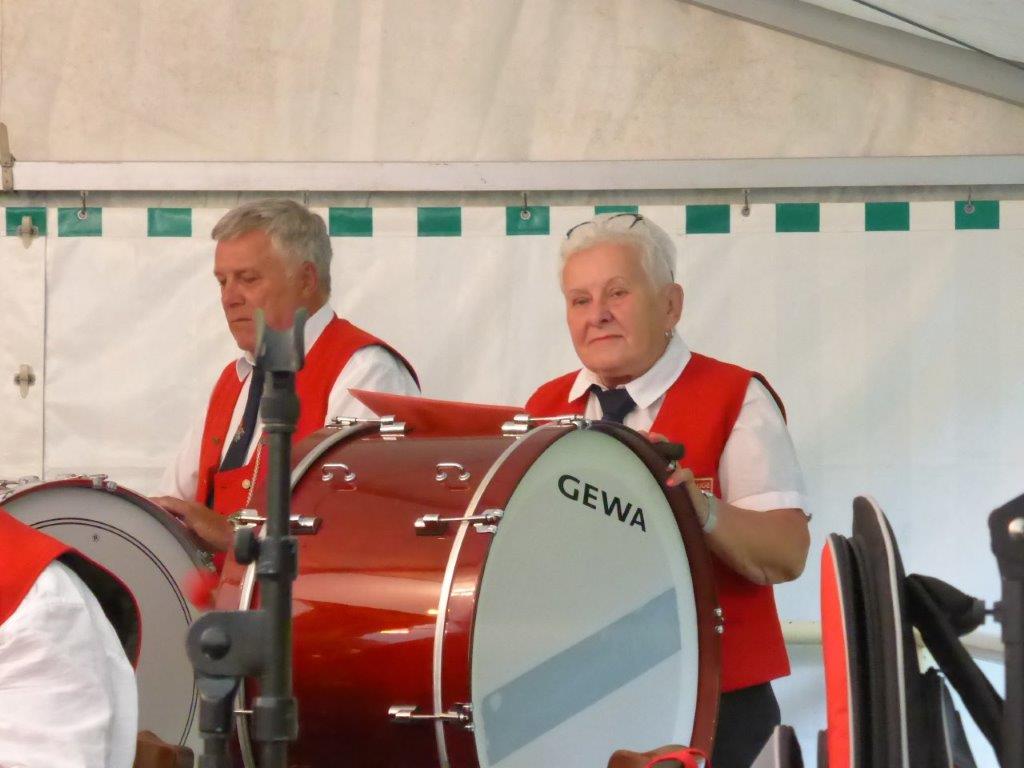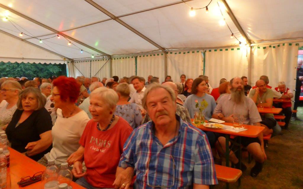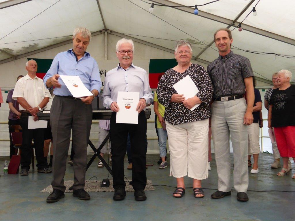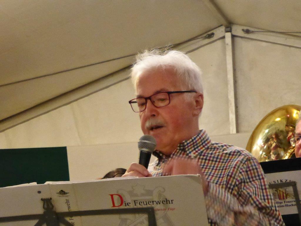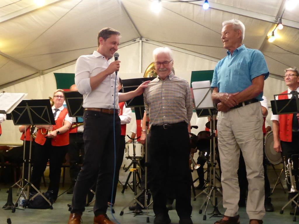 Die Gymnastikdamen des FVH folgten und entführten nach Paris, begleitet auf dem Akkordeon von Monsieur Eichsteller und seine Mme. Heidi motivierte: entré, entré, Mesdames, Monsieurs. Das gefiel dem Publikum, ebenso der Song „Heißer Sand“, den wir diesen Sommer auch am Bali spüren können. Brigitte Lang hatte die Mädels beim Dirigieren souverän im Griff. Die nächste Gruppe, die Prismaten, ließen´s krachen mit ihren Liedern und das Publikum sang begeistert mit, fühlte diese Lebensfreude, die da herüberkam, einfach toll, super, dass ihr da wart. Die Herren der TrimmDich-Gruppe des FVH musste sich auch nicht verstecken, mit Wolfgang König auf der Gitarre begleitet, kamen die Lieder gut an, vor allem konnte man einige Sangestalente heraushören. Wir wären mächtig stolz, wenn da der eine oder andere auch mal freitags zum Singen in den Erlich kommen würde!! Die Sangesgruppe der FFW überzeugte mit dem Erlich-Lied und ihren anderen Liedern natürlich die Besucher und hatten mit instrumentaler Begleitung und der sonoren Stimme von Roger Seitz viele Höhepunkte zu bieten. Alle aufgetretenen Gruppen waren super, so konnte unser Vorstand nur erste Plätze vergeben, ein Danke euch allen. Dazwischen fungierte unser Sänger Rainer als Moderator, gekonnt wie immer und mit nicht ganz jugendfreien Witzchen versehen, gab er seine Kommentare zu den aufgetretenen Gruppen. Diese bekamen symbolisch eine Flasche Sekt überreicht und unser Rainer verabschiedete sich nun nach 25 Jahren als Moderator vom Publikum, was stehende Ovationen und bewegende Momente auslöste, ist er doch unser Original und vom Erlich nicht wegzudenken. Auch unser Bürgermeister Michael Möslang und unser Ehrenbürger und Altbürgermeister Waldemar Schütz zollten Rainer Anerkennung für sein Engagement, das so schnell niemand ersetzen kann – Spitze Rainer, bravo! Die Herren hatten bereits Stellung auf der Bühne bezogen zu unserem obligatorischen Festabschluss, dem Badnerlied mit dem Musikzug der FFW. Das Publikum erhob sich und stimmte in die Strophen ein – welch eine Atmosphäre und eine Stimmung. Zuvor hatte Herr Möslang noch angekündigt, nächstes Jahr einen Rathaus-Chor für das Fest stellen zu wollen, eine schöne Idee, aber es fehlt unbedingt an Nachwuchs für unseren GV und so ein Fest zu stemmen, ist nicht einfach. Deshalb noch einmal ein Appell an alle, die hier so schön mitgesungen und mitgemacht haben: Freitags 19.30 Uhr ist unsere Singstunde, einfach mal reinschnuppern, Gefallen finden und am liebsten bleiben, dann hat unser Vereinsleben Bestand und wir würden uns riesig freuen. Hier auch noch einmal ein riesiges Dankeschön an all unsere Helfer über die Festtage – IHR wart großartig!!