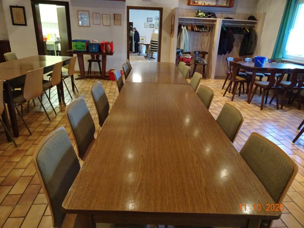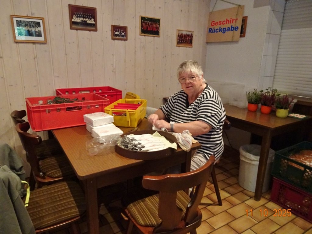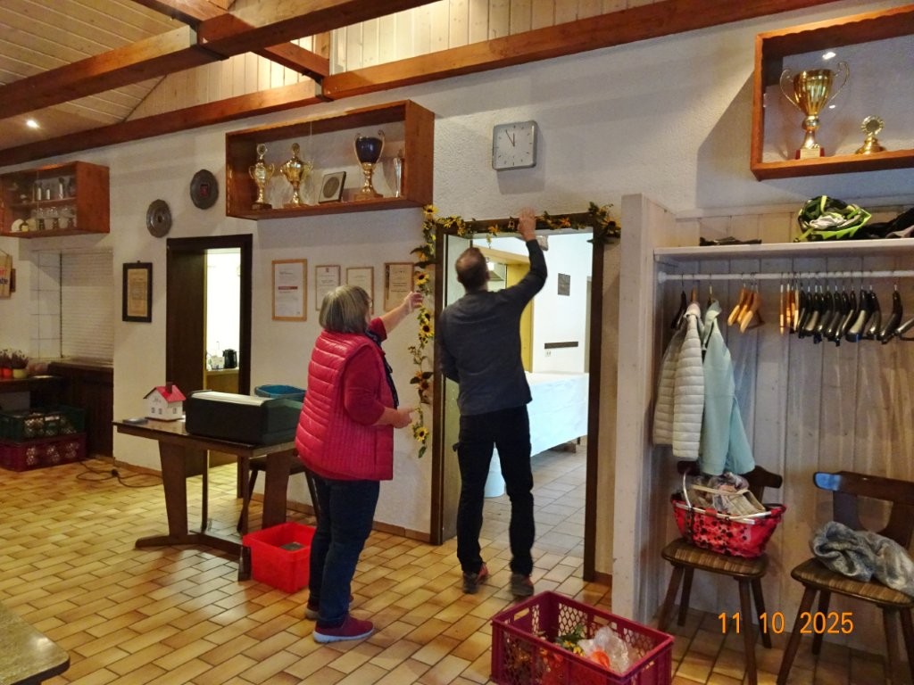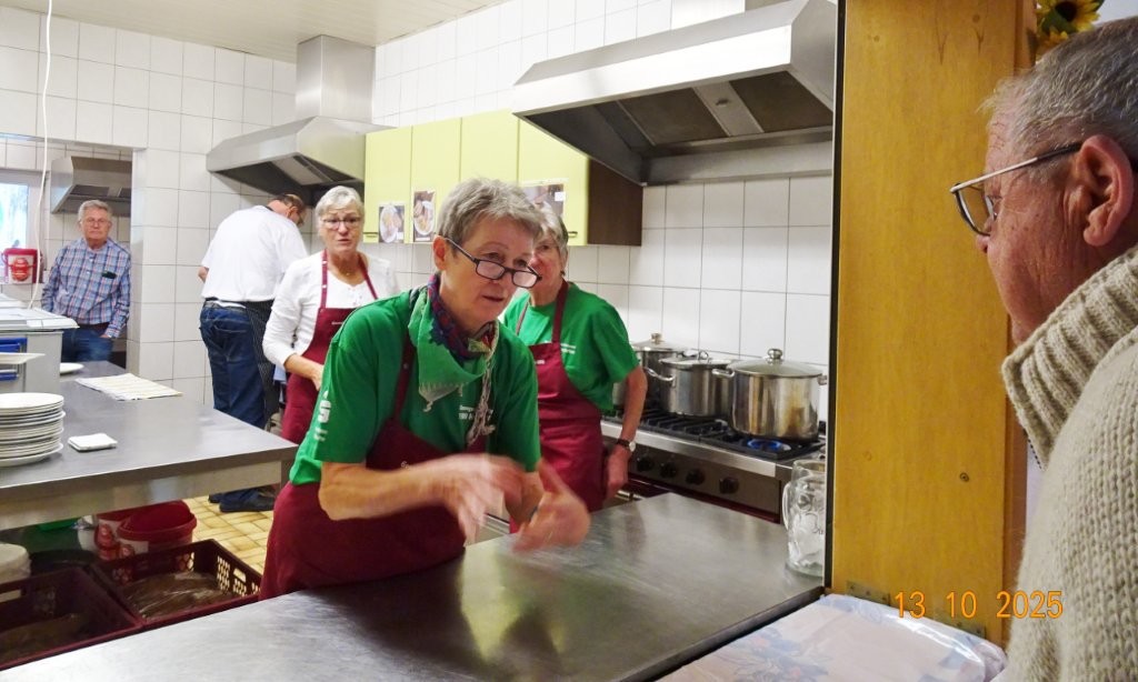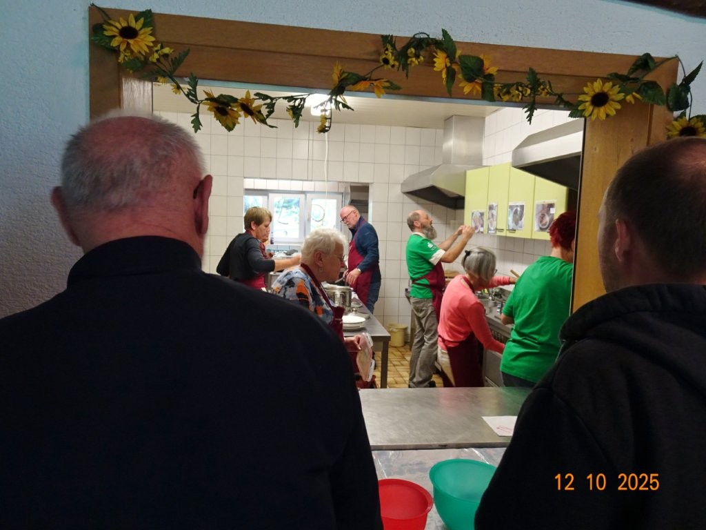 Samstags war ebenso eine Arbeitsgruppe im Einsatz, die das Vereinsheim für die Gäste herrichtete und mit herbstlicher Deko verschönte. In der Küche war Großeinsatz mit den Vorbereitungen für das leibliche Wohl der erwarteten Gäste. Die kamen dann auch am Sonntag so nach und nach in unser Vereinsheim und wie man hörte, hat das deftige Essen gemundet. Die verschiedenen Ressortleiter haben sich mit ihren Teams bewährt und die Gäste gut bewirtet. Auch die Kuchentheke war immer wieder belagert, denn dort lockten leckere Torten und Kuchen unsere Besucher an. Zur Unterhaltung gab´s Akkordeonmusik von Klaus Eichsteller.