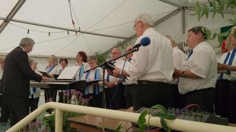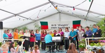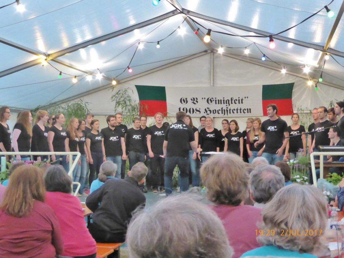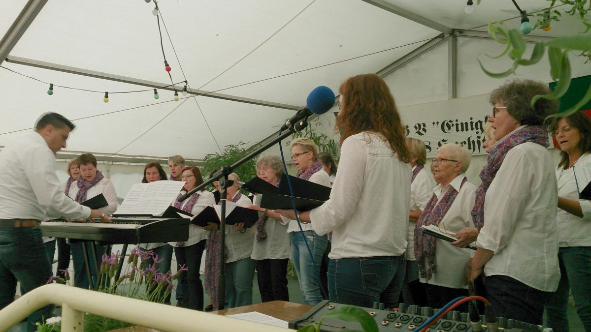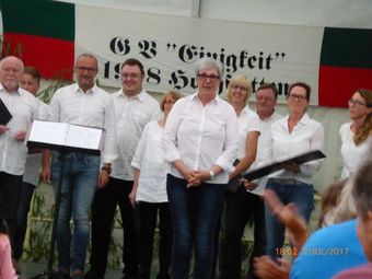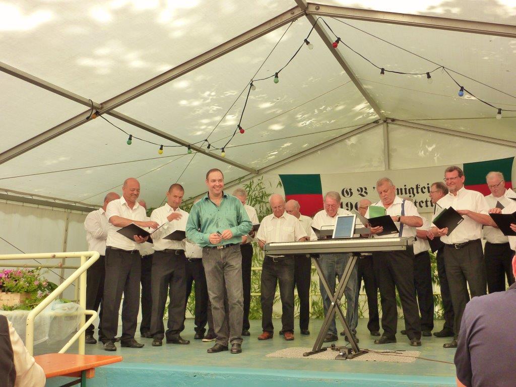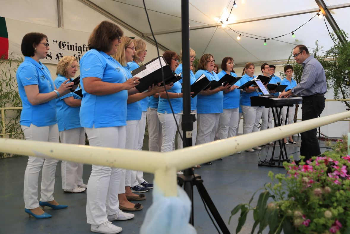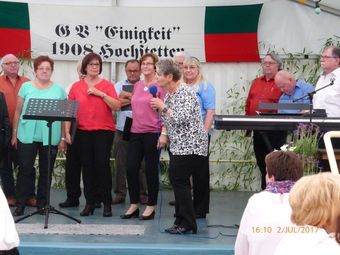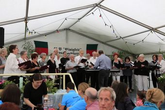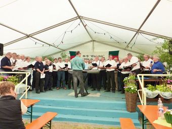 Samstags vor dem Fest liefen die Vorbereitungen im Erlich auf Hochtouren für unser Sommerfest. Am Sonntagmorgen um 10.00 Uhr begann der musikalische Frühschoppen und unser Chor eröffnete den Reigen mit drei Liedern, bevor unser 1.Vorsitzender Klaus Reinhardt die anwesenden Gäste begrüßte. Es folgten der Männerchor (mit Frauen) der Eintracht Graben, der Frauenchor des Sängerbundes Friedrichstal, der Männerchor der Sängervereinigung Liedolsheim und der gemischte Chor der Eintracht Neuburg, letzterer unter der Leitung von Uli Kofler. Rainer Ritz moderierte am Morgen wieder mit Witz und Schlagfertigkeit durchs Programm und erklärte, wir hätten Uli Kofler das Duppenglas in unserem Bestand zu verdanken. Uli Kofler erzählte dann auch von seinem letzten Besuch beim Hochstetter Sängerfest, welches für ihn auf dem Heimweg schmerzlich endete. Nun war er jedoch wieder absolut da und testete das Publikum mit „Kein schöner Land“ auf seine Textsicherheit. Das klappte ganz gut und das morgendliche Programm stimmte mit den verschiedenen, sehr gelungenen Liedvorträgen der Chöre auf einen schönen Tag ein.