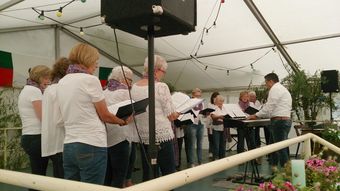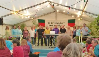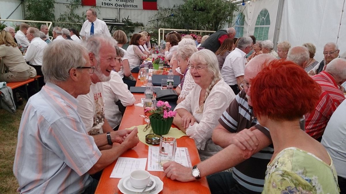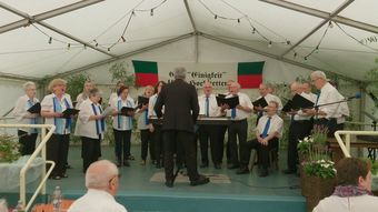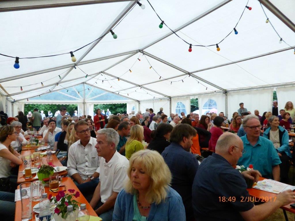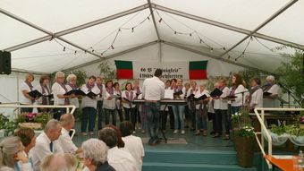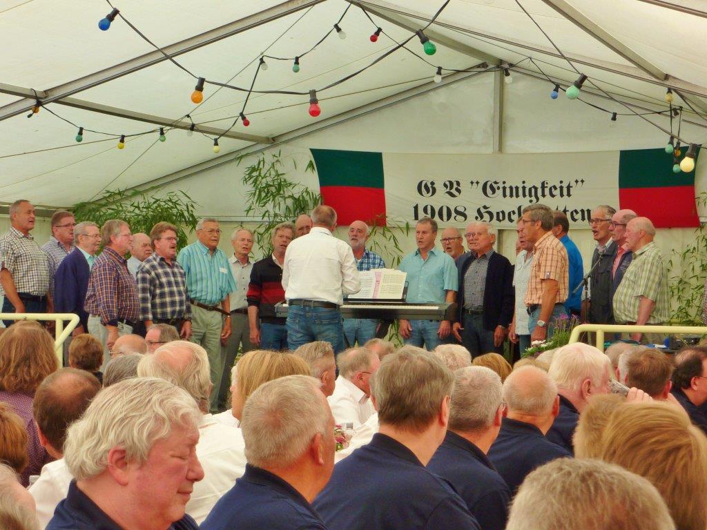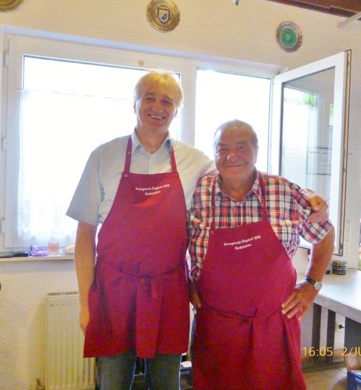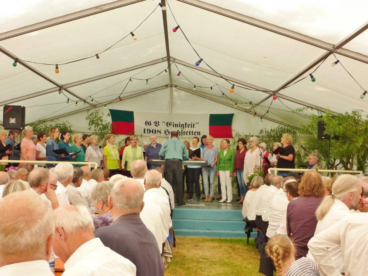 Samstags vor dem Fest liefen die Vorbereitungen im Erlich auf Hochtouren für unser Sommerfest. Am Sonntagmorgen um 10.00 Uhr begann der musikalische Frühschoppen und unser Chor eröffnete den Reigen mit drei Liedern, bevor unser 1.Vorsitzender Klaus Reinhardt die anwesenden Gäste begrüßte. Es folgten der Männerchor (mit Frauen) der Eintracht Graben, der Frauenchor des Sängerbundes Friedrichstal, der Männerchor der Sängervereinigung Liedolsheim und der gemischte Chor der Eintracht Neuburg, letzterer unter der Leitung von Uli Kofler. Rainer Ritz moderierte am Morgen wieder mit Witz und Schlagfertigkeit durchs Programm und erklärte, wir hätten Uli Kofler das Duppenglas in unserem Bestand zu verdanken. Uli Kofler erzählte dann auch von seinem letzten Besuch beim Hochstetter Sängerfest, welches für ihn auf dem Heimweg schmerzlich endete. Nun war er jedoch wieder absolut da und testete das Publikum mit „Kein schöner Land“ auf seine Textsicherheit. Das klappte ganz gut und das morgendliche Programm stimmte mit den verschiedenen, sehr gelungenen Liedvorträgen der Chöre auf einen schönen Tag ein.