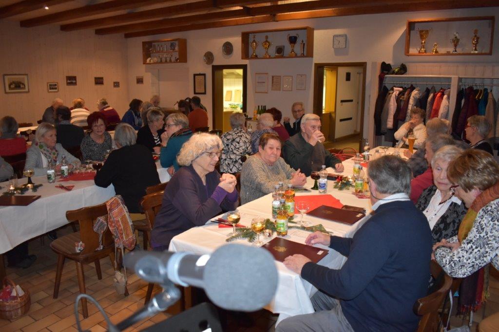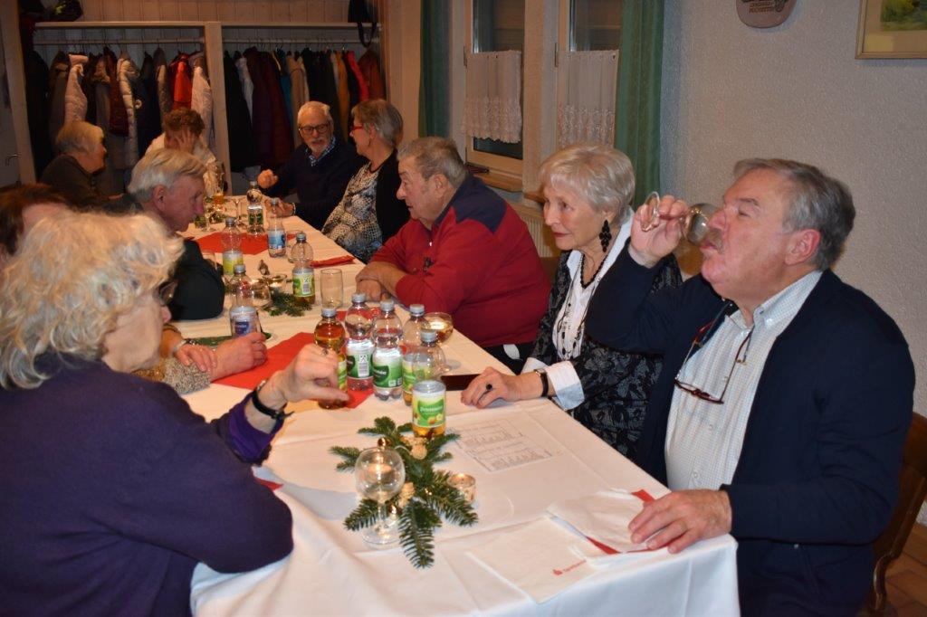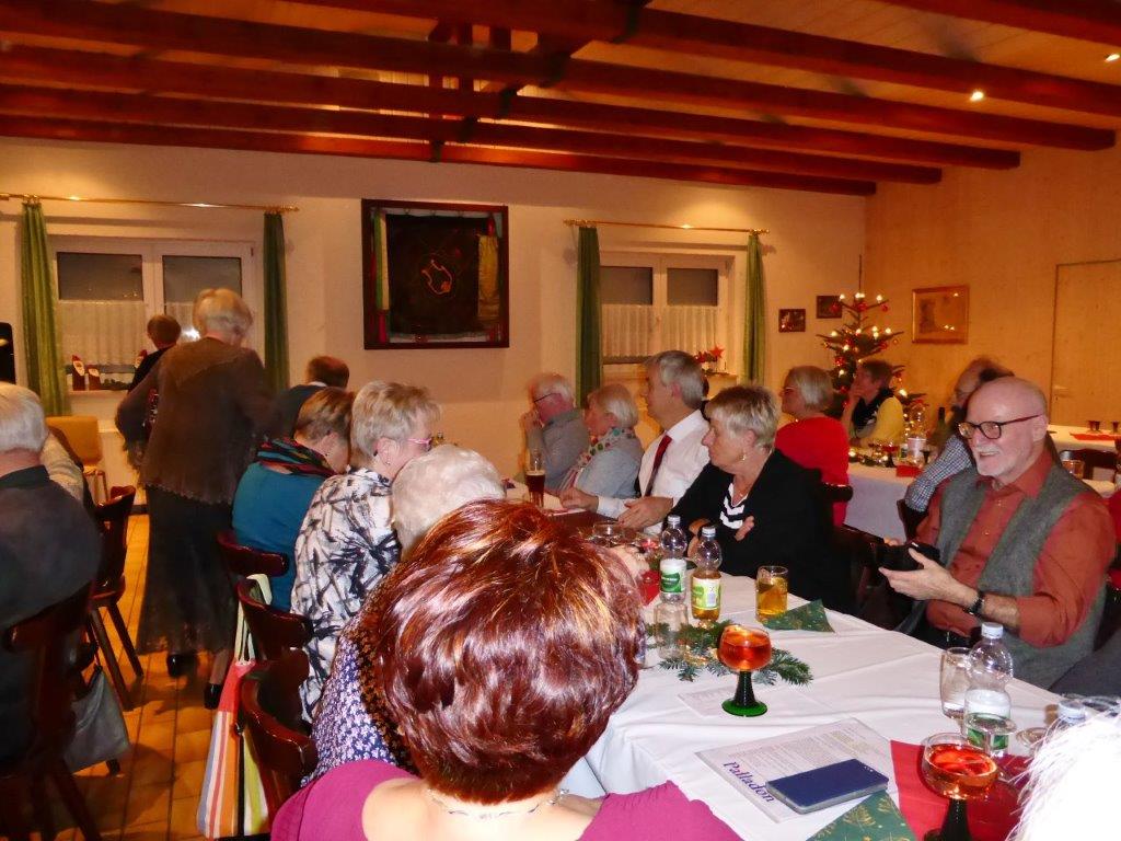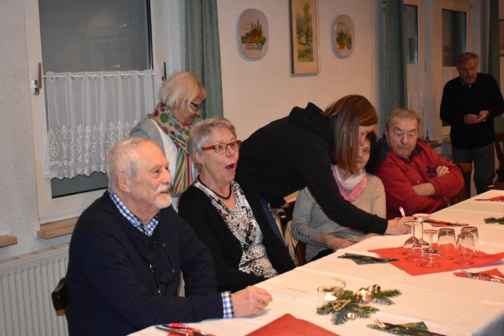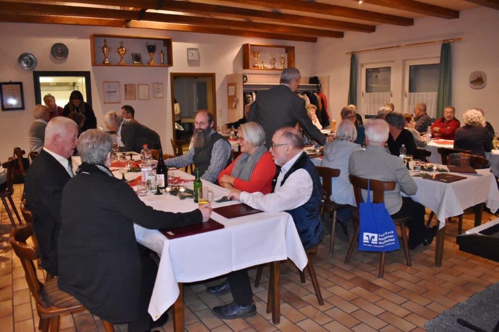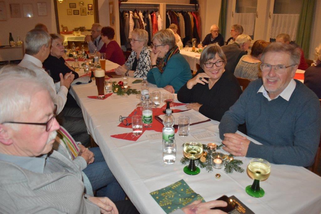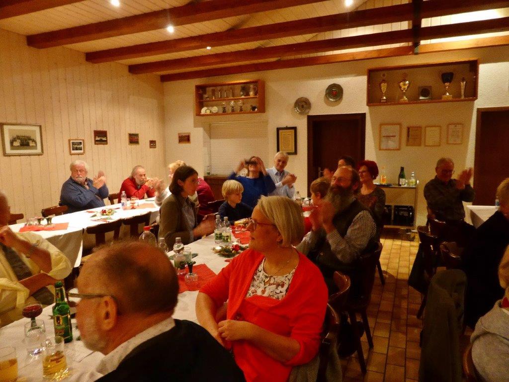 Endlich durften wir nach 3 Jahren wieder im Erlich zusammen kommen und mit Tannenbaum, Kerzenlichtern und festlicher Stimmung an den Tischen Platz nehmen. Unser Vorstand Klaus Reinhardt begrüßte alle Anwesenden und wünschte einen schönen Abend und den hatten wir. Zuerst sangen wir mit Aldo sechs Weihnachtslieder, eine gute Mischung und Rainer Ritz durfte beim „Weihnachtsgesang“ als Solist brillieren, gekonnt ist eben gekonnt! Dann konnte das von Vanny gelieferte warme Buffet eröffnet werden, das war auch gelungen, einschließlich der feinen Salate unserer Sängerinnen. Mit Getränken wurden wir auch versorgt, da waren unsere drei fleißigen Küchenfeen im Einsatz und wir konnten das leckere Essen entspannt genießen. Im Anschluss überreichte Klaus Reinhardt unserem Dirigenten Aldo Martinez eine Weihnachtstüte mit Dankesworten, über die sich Aldo sehr freute und sich bedankte. Leider musste er unsere Feier schon verlassen, da er noch eine andere familiäre Verpflichtung hatte. Nun übernahm unsere Sängerin Ute König das Zepter und führte uns mit sehr viel Gefühl durch das Programm. Heidi und Klaus Eichsteller eröffneten den Reigen mit einem musikalischen Beitrag, es folgte Christa Jung-Wittiger mit einer Weihnachtsgeschichte, wie eine köstlich gebratene Ente unerwartete Gaumenfreuden für Obdachlose unter einer Brücke bescherte. Klaus Reinhardt verlas auch eine in diese unruhige Zeit passende Geschichte, gefolgt von einem schönen Gedicht, das Hildegard Setzchen vorlas. Hannelore Dürr hatte eine rührende Geschichte über ein Enkelkind und eine verlorengegangene Masche in einem von ihm selbst gestrickten Schal, den die Oma bekommen sollte. Reinhilde Fürniß hatte ihre Gitarre dabei und sang uns das Lied „Joseph“ von Georges Moustaki – sehr gut, Reinhilde. Das Flötenspiel von Heidi Eichsteller beeindruckte auch, ebenso die Stücke, die uns Klaus Eichsteller auf seinem Keybord vorspielte. Nun war es Zeit für eine süße Pause! Unsere Helferinnen hatten emsig die Desserttafel gedeckt mit feinen Cremes, Obstsalat, Plätzchen, Orangenkuchen, ja sogar warmen Apfelstrudel mit Vanillesoße, frisch gebacken und serviert von unserem Koch Robert. Dankeschön, da gings uns doch wieder richtig gut!! Da konnten wir der „hinterlistigen Geschichte“ von Rainer Ritz gewappnet entgegensehen. Hartmut sang uns danach das Lied einer fränkischen Weihnacht mit einer knusprig gebratenen Weihnachtsgans, die sich wohl nicht rechtzeitig in Sicherheit gebracht hatte und sogar der Oma, püriert durch den Strohhalm gesogen, mundete. Super Hartmut! Nun folgte ein Sketch unter der Regie von Klaus Eichsteller mit einem ganz aktuellen Thema: Glasfaser und Hotline! Von den ewigen Warteschleifen bei Anruf der Hotlines kann doch bald jeder ein Lied singen. Das bekam auch die Familie Wockenberg zu spüren, authentisch gespielt von: Heidi Eichsteller und Robert Schnell und Tochter: Jola Strzlecka und Rainer Ritz, der den schlitzohrigen Opa mimte. Köstlich, was dieser Sprachcomputer am Telefon versteht und letztendlich nicht an den nächsten freien Mitarbeiter verbindet, sondern den Anrufer zur Verzweiflung und gar zur Aufgabe bringt. Tolle Vorführung, danke den Akteuren! Heidi und Klaus Eichsteller beendeten mit einer Musikeinlage das Abendprogramm, natürlich in französisch, Heidi´s Spezialität, très bon! Überhaupt an Heidi und Klaus ein riesiges Dankeschön, haben sie doch einen Großteil des Programms gestaltet. Auch allen anderen Mitwirkenden des Abends vielen Dank, unserer Ute, die uns gekonnt durchs Programm führte, dem Küchen-Service-Team, unserem Vorstand für den tollen Weihnachtsbaum und merci für all die leckeren Salate und Desserts – fein gemacht.