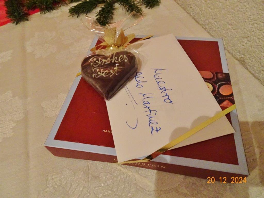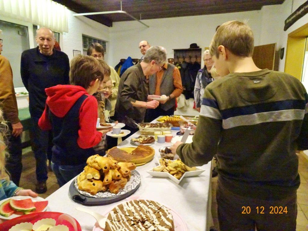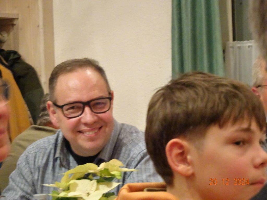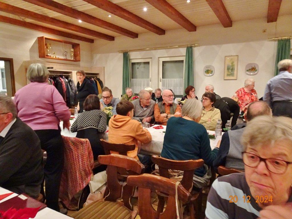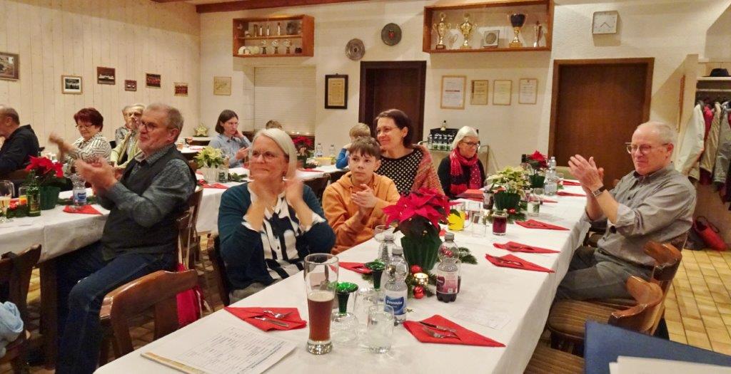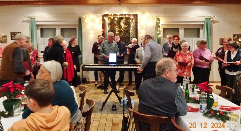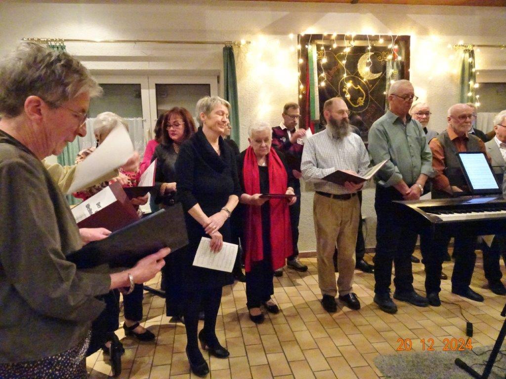 Unsere Weihnachtsfeier fand am 20. Dezember im richtig schön geschmückten Vereinsheim statt und war sehr gut besucht. Aldo Martinez traf mit Frau und Sohn pünktlich im Erlich ein und wir begannen den festlichen Abend mit vier Weihnachtsliedern, die wir gekonnt absolvierten. Der 1. Vorsitzende Klaus Reinhardt begrüßte freudig alle Anwesenden und eröffnete danach das Buffet. Ein Partyservice hatte uns die warmen Speisen geliefert und von den Sängerinnen wurden wieder tolle Salate und Desserts beigesteuert. Nach dem Essen eröffnete Klaus Eichsteller mit einem Hirtenlied und einer Wintermärchen-Liebesballade auf seinem Keyboard das Unterhaltungsprogramm, durch das uns unser Sänger Hartmut auf lockere Art führte. Reinhilde Fürniß trug zuerst ein Gedicht vor, bevor sie uns dann mit ihrer Gitarre ein Lied über die weiße Weihnacht spielte und sang – gut gemacht Reinhilde. Christa Jung-Wittiger las ein Gedicht über eine freche Weihnachtsmaus vor, die wohl über Tage für den Schwund der Weihnachtsbrödlen verantwortlich war. Das gefiel besonders den anwesenden Kindern, die dabei sein und mit uns feiern durften. Hannelore Dürr´s Engelsgedicht zeigte einige Erkenntnisse auf, die uns zwar bewusst, aber leider doch oft nicht umgesetzt werden. Das regte zum Nachdenken an, bevor wir uns dem reich bestückten Dessertbuffet widmen durften, mmhm, lecker!! Es ging uns gut an diesem Abend, auch dank unserer Küchenfeen Alexandra und Heidi, sowie Marion, die uns mit Getränken versorgte, so ließ es sich bestens aushalten. Nach diesen Schlemmereien war es an der Zeit, unserem Dirigenten ein Präsent zu überreichen. Klaus Reinhardt tat dies mit einigen Dankesworten an Aldo Martinez, mit dem das Üben in der Chorprobe Woche für Woche riesigen Spaß macht. Wer dies auch mal testen möchte, kann gerne freitags in den Erlich kommen. Zu Klaus Reinhardt`s Überraschung erhielt auch er eine Weihnachtstüte, als kleine Anerkennung für seine Arbeit als 1. Vorsitzender, die er das ganze Jahr über leistet. Ein Dank auch für den wunderschön geschmückten Weihnachtsbaum, den uns Klaus jedes Jahr für unsere Feier im Erlich zur Verfügung stellt.