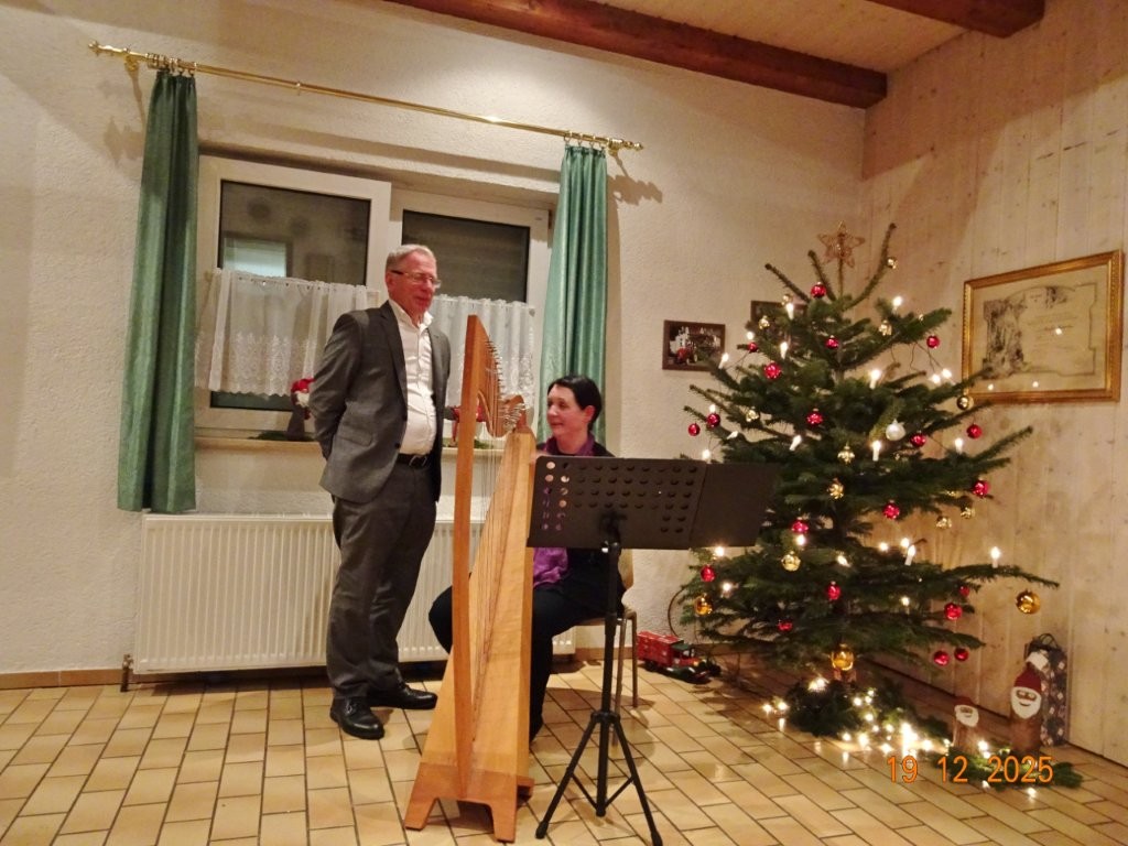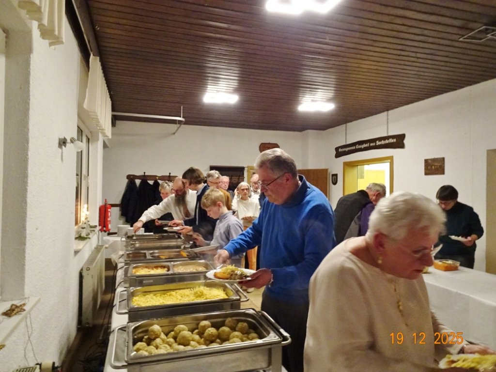 Am Tag zuvor fanden sich ein paar fleißige Helferinnen und Helfer ein, um Tische zu stellen für die Weihnachtsfeier und zum anschließenden Dekorieren. Dekomaterial vor Ort ist genügend vorhanden, da ist so mancher Schatz dabei und es wurde die Saal- und Tischdeko liebevoll zusammengestellt. Ergänzt mit Blumenstöckchen und Tannengrün ergab das ein schönes Bild für die Weihnachtsfeier am nächsten Tag. Nach und nach trafen die Besucher im Erlich ein, darunter unser Ehrenbürger Waldemar Schütz und seine Partnerin. Der Partyservice kam auch pünktlich und brachte die ausgewählten und von Klaus Eichsteller bestellten warmen Speisen, danke Klaus. Die Sängerinnen und Sänger trugen mit Salaten und Desserts zum lukullischen Genuss bei.