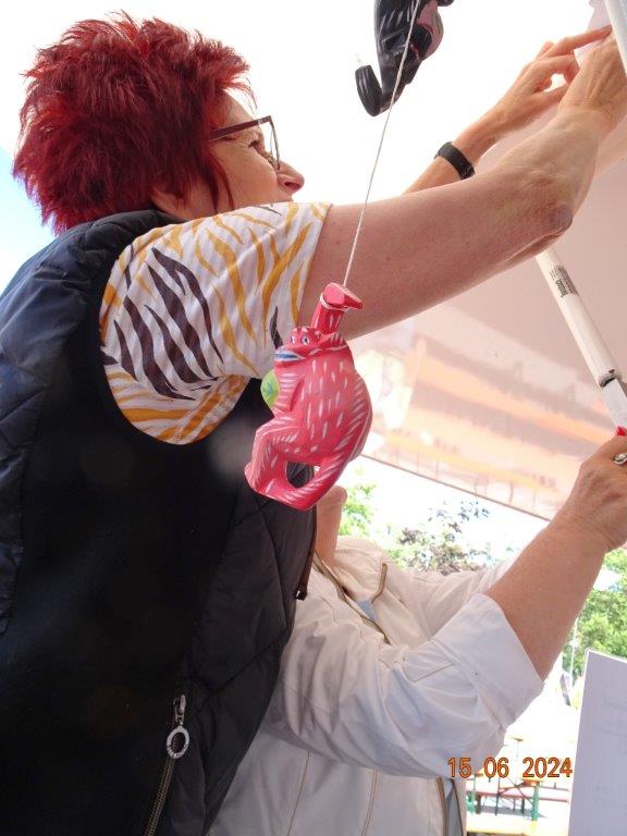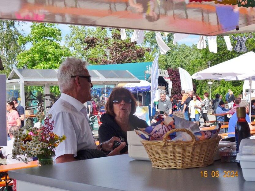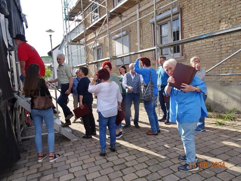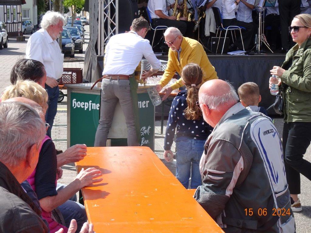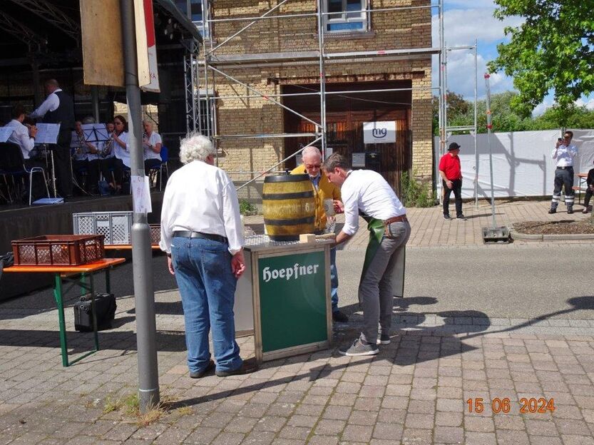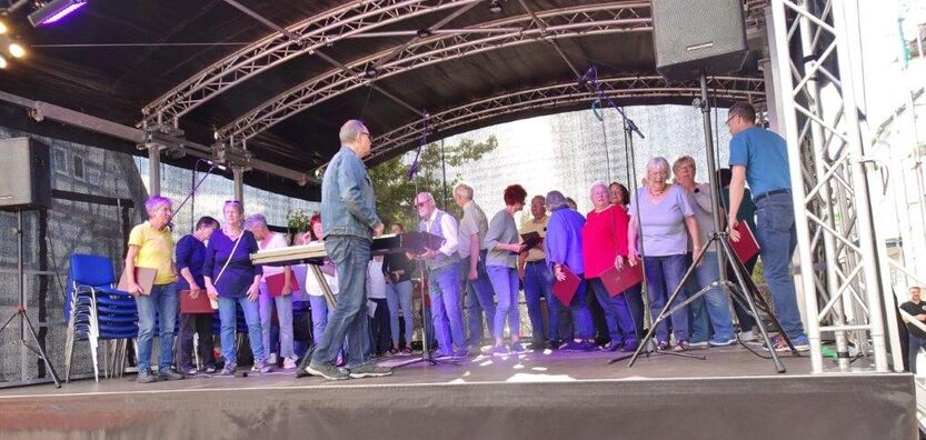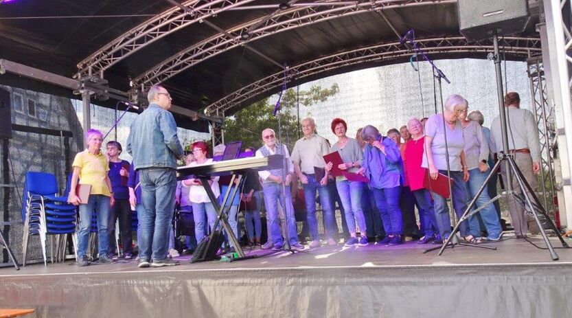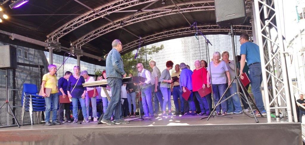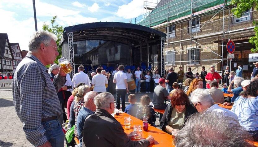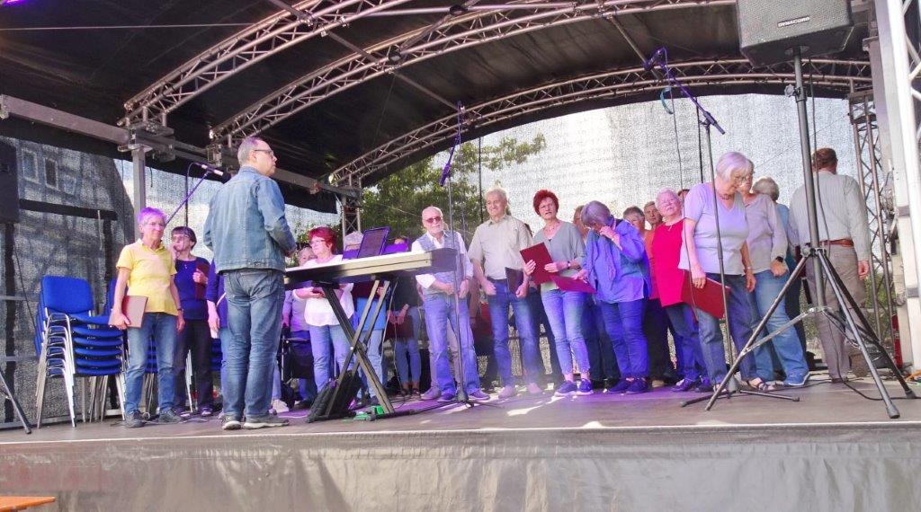 Der Wettergott zögerte morgens noch, aber nachmittags schenkte er uns allen für das Weschbugglfeschd das passende Wetter. Ab 9.30 Uhr hatten schon die Arbeitseinsätze im Erlich und auf dem Weschbugglfeschd-Gelände begonnen. Überall wurde fleißig gewerkelt mit Vorfreude auf die kommenden Besucher. Das letzte Weschbugglfeschd war 2018 und so war auch eine gewisse Aufregung bei den teilnehmenden Vereinen, wie das Fest wohl angenommen wird. Die Eröffnung war um 16.00 Uhr durch den Musikverein Linkenheim-Hochstetten und der Begrüßung unseres Bürgermeisters Michael Möslang und dem Vorsitzenden des Musikvereins Ulrich Radhofer. Es wurde ein toller musikalischer Auftakt des Orchesters unter der Leitung von Thorsten Reinau geboten und dann folgte der Fassanstich durch unseren Bürgermeister, der mit „ozapft is“ den begehrten Bierausschank mit Herrn Radhofer und Herrn Raetsch bewältigte. Ein weiteres Highlight war der Auftritt einer Percussion-Gruppe mit einigen Musikern des MV und einer Musikschule, die uns mit heißen Rhythmen nach Südamerika entführten und zum Mitbewegen animierten, absolut super! Unser Auftritt war kurz vor 19.00 Uhr und wir gingen mit dem Eventchor auf die Bühne. Zuerst sang nur unser Chor die Lieder „Wunder gibt es immer wieder“ und „Eres tu“ und mit dem Eventchor „Über sieben Brücken“, Verlieben, verlorn...“ und als Abschluss „Amigos para siempre“. Dem Publikum vor der Bühne hat´s gefallen und wir bekamen reichlich Applaus.