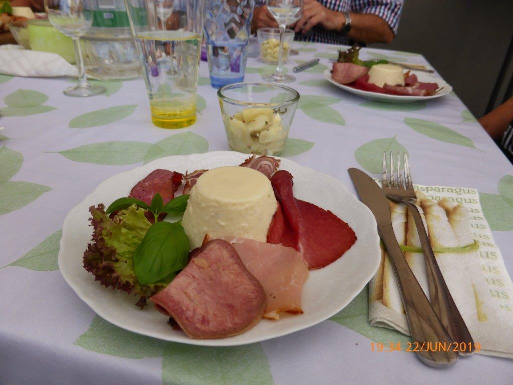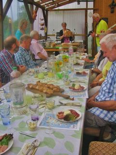 Wie gewöhnlich ist vor einer solchen Probe eine anständige Grundlage erforderlich. Dafür hatte Hannelore eine hervorragende Vorspeise vorbereitet. Selbstgebackene Brote, dafür ist sie ja weithin bekannt, nicht nur in Sängerkreisen. Dazu gab es verschiedene Dips und einen Teller mit fünf Sorten Schinken, den Harald selbst räuchert in der Mitte dekoriert mit einer Spargel-Panna Cotta. Nach diesem Genuss, der schon einige Zeit in Anspruch nahm, konnten wir in das „Tagesgeschäft“ einsteigen.