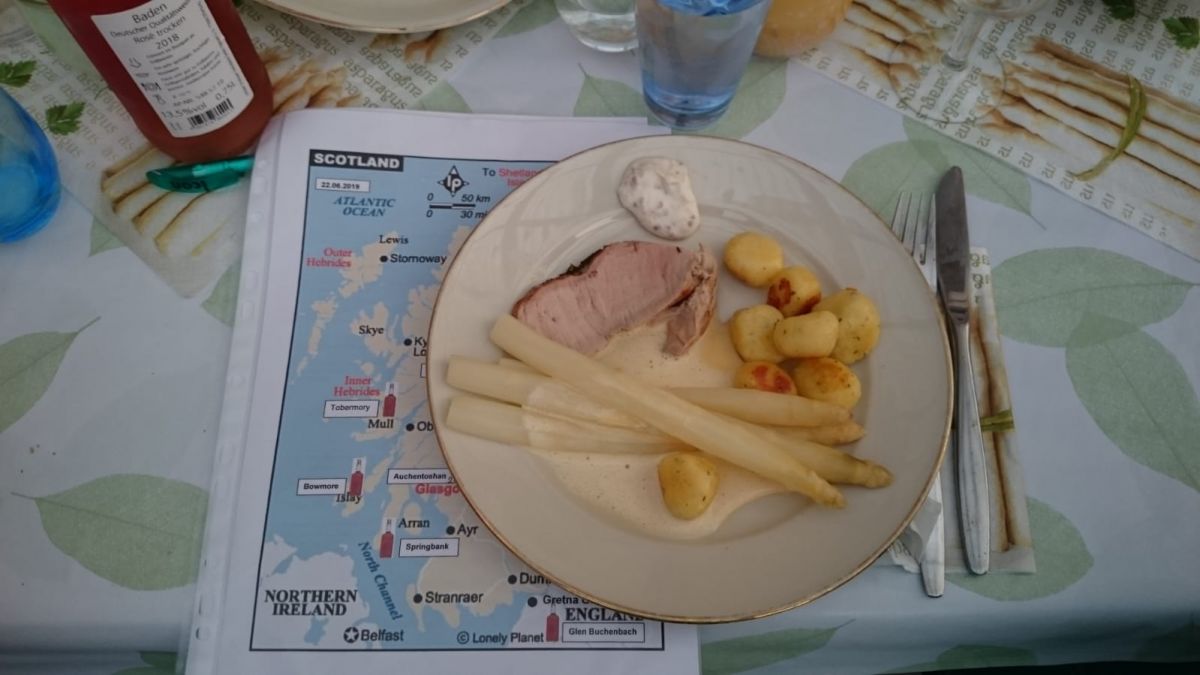 Zu erwähnen wäre noch: Henry stiftete den Whisky, Rainer den Spargel Hannelore und Harald das Essen und die übrigen Getränke. Der Rest warf einen Obolus in den