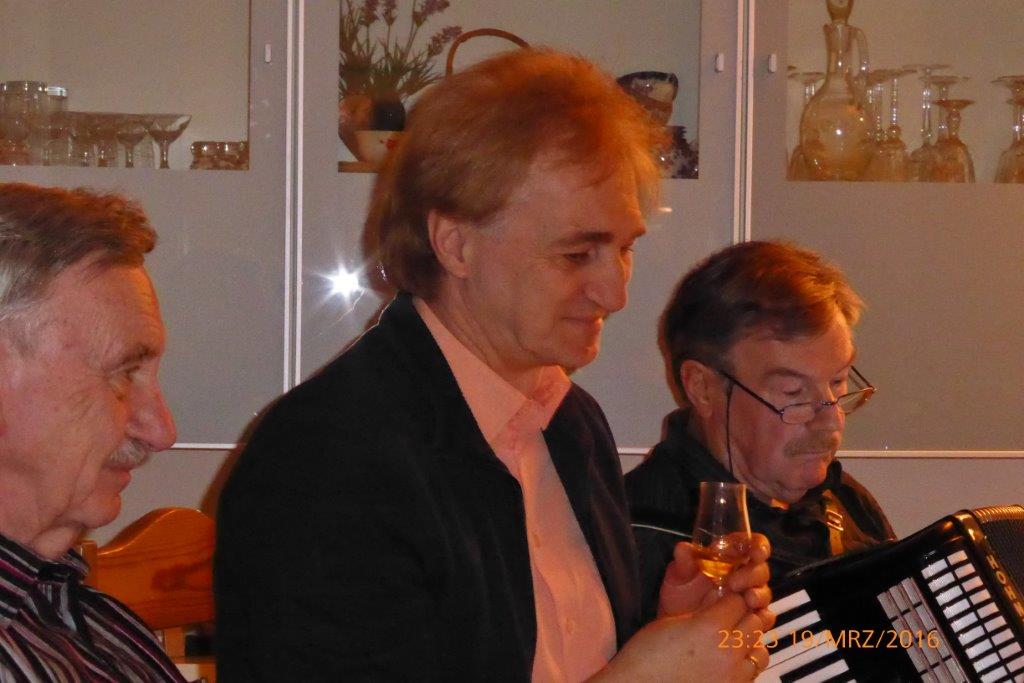 Bevor die letzen beiden Whiskies kredenzt wurden, servierten uns die Damen noch Rosis wunderbaren Nachtisch "Maronencreme mit Sahne und Kirsche" wirklich traumhaft. Da fragt sich der geneigte Leser: "Wo bleibt der eingangs erwähnte Gesang?" Gemach, gemach... denn mit steigender Anzahl der Proben steigt auch der Drang zum Singen, so konnten wir es kaum erwarten nach der letzten Probe loszulegen. Da Robert Burns auch Lieder geschrieben hat, war es natürlich selbstverständlich sein bekanntestes Lied "Should Auld Acquaintance..." als erstes zu singen. Und, da Klaus Eichsteller wie zufällig sein Akkordeon dabei hatte, gab es nun kein Halten mehr. Zum Glück haben Hucks verständisvolle Nachbarn.